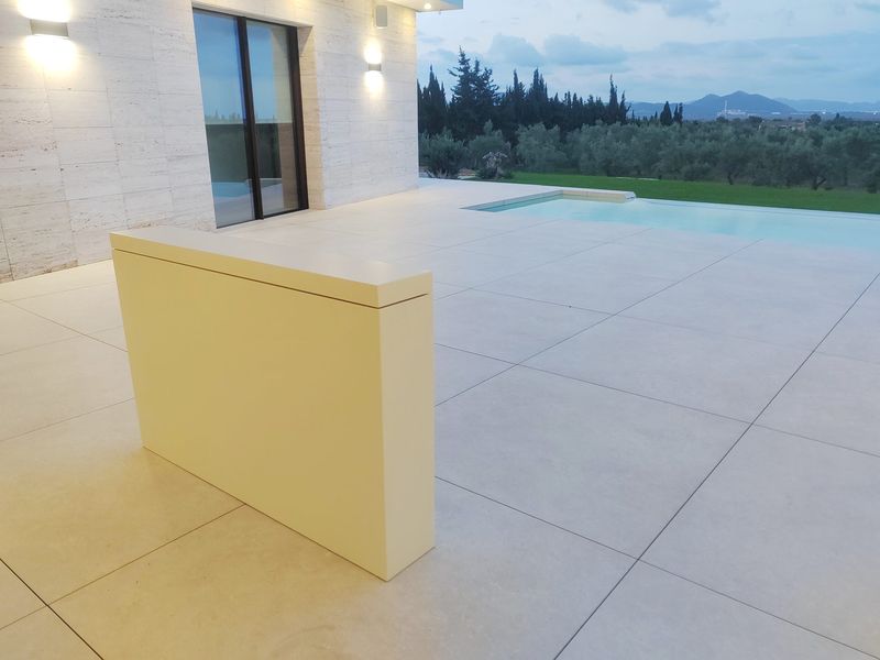 Mueble fabricado a medida para tv de 46", con diseño asimétrico. Este mueble logra ocultar la televisión en el exterior de esta fabulosa terraza/ático dentro de la exclusiva urbanización "La Finca" de la ...