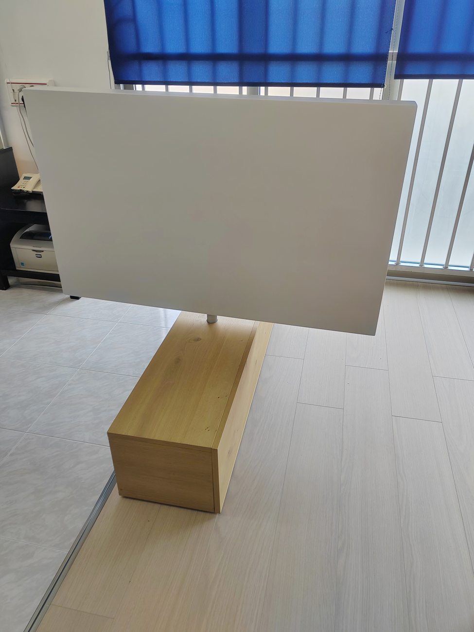 El mueble incorpora un módulo giratorio suspendido en MDF hidrófugo y lacado al horno en blanco base, con acabado mate. Este mueble permite girar la tv 360° de forma robusta, estable y cómoda.