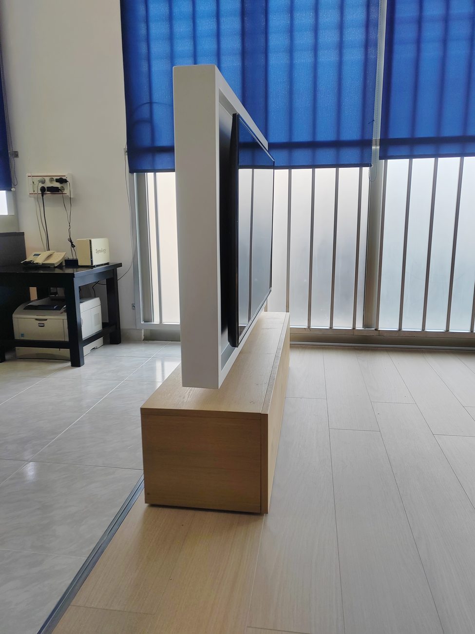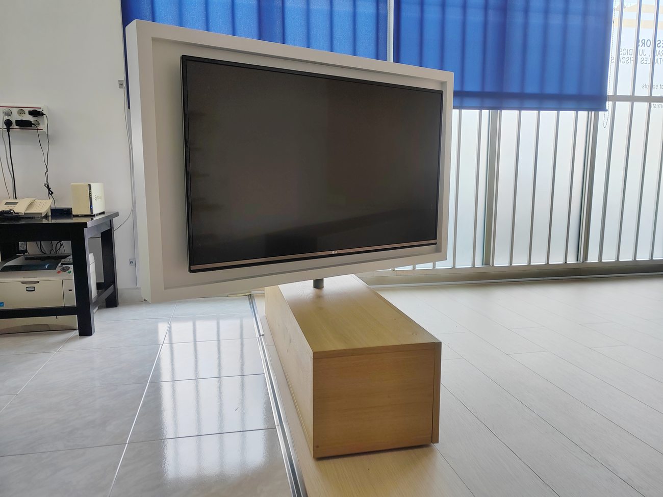 Este llamativo mueble tv giratorio otorga comodidad a la estancia permitiendo visionar tus series y programas favoritos desde diferentes zonas del hogar.