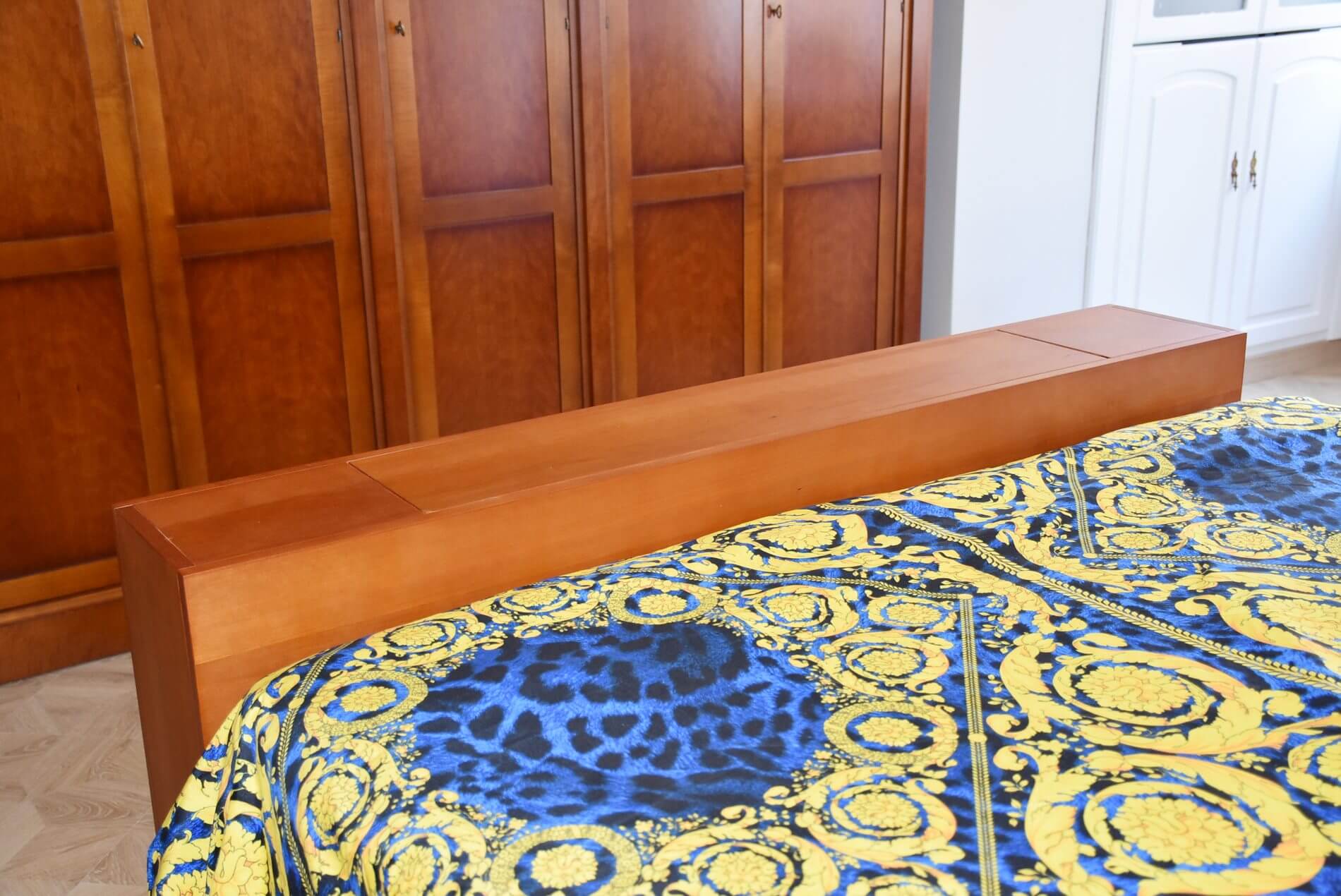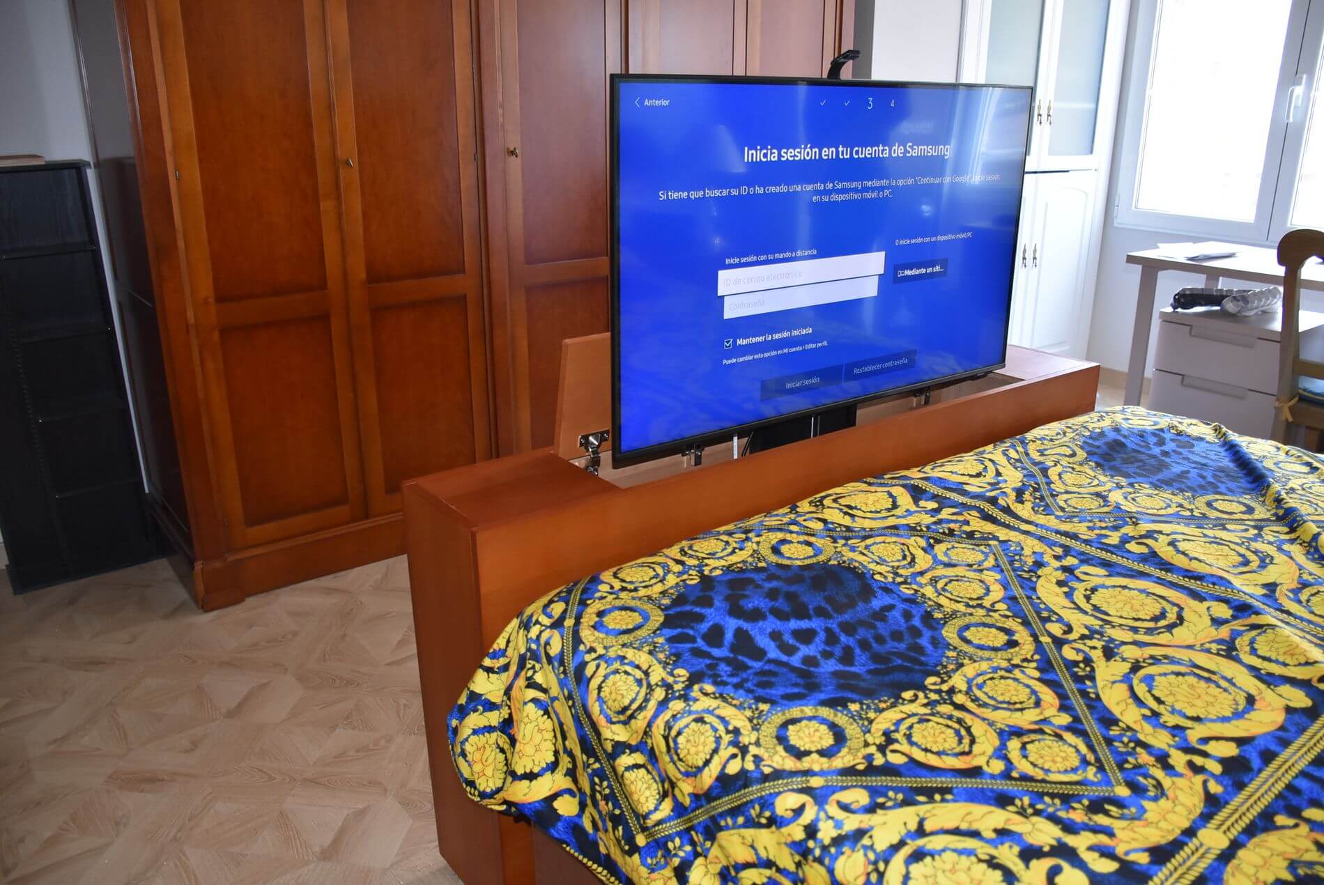 Mueble a medida a los pies de la cama fabricado en madera de cerezo. Sistema silencioso de elevación y ocultación de TV.