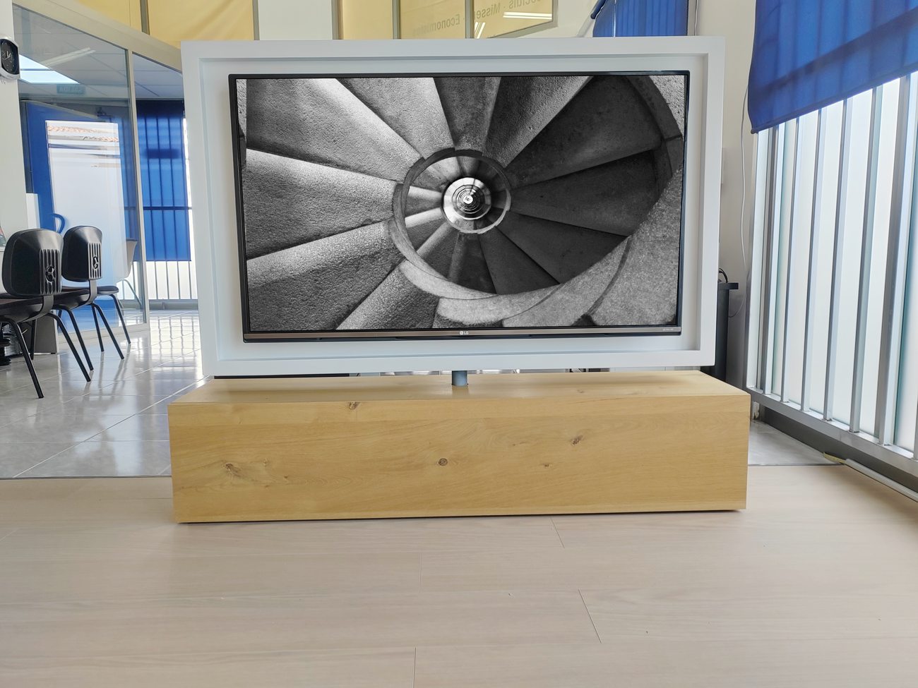 Mueble tv giratorio 360° en roble y módulo tv blanco lacado. MUEBLE DE EXPOSICIÓN. Este mueble se encuentra en nuestro pequeño showroom de Inca en Mallorca. Listo para enviar en pocos días siempre que no requiera ...