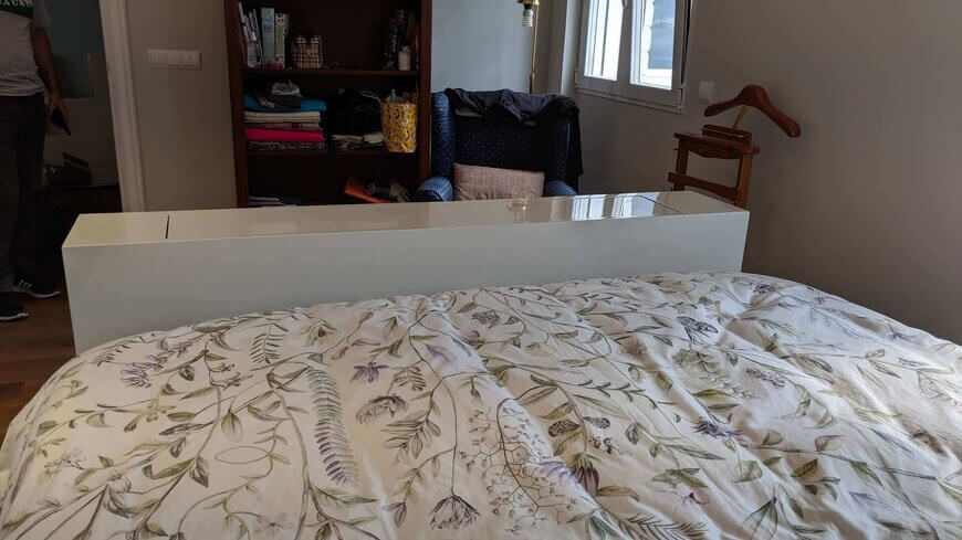 Solución para dormitorio a los pies de la cama. Mueble tv oculta lacado blanco para cama de 160cm. Instalado en Barcelona, este mueble se integra a la perfección con los tonos y la decoración del dormitorio.