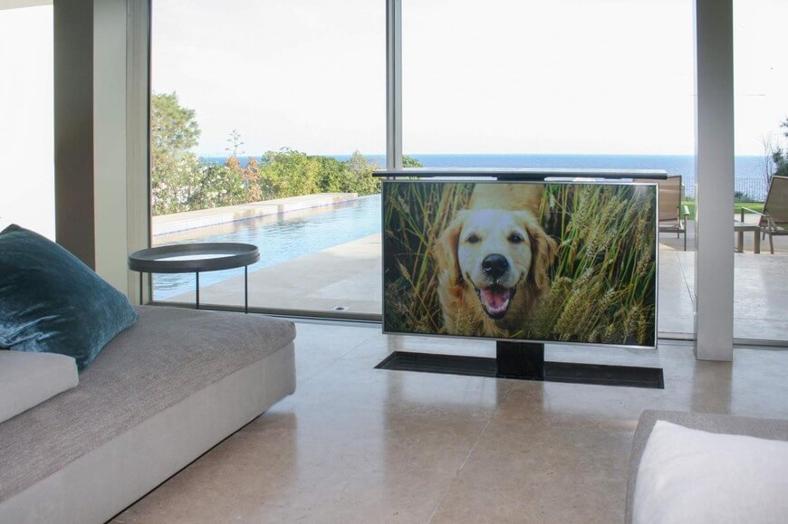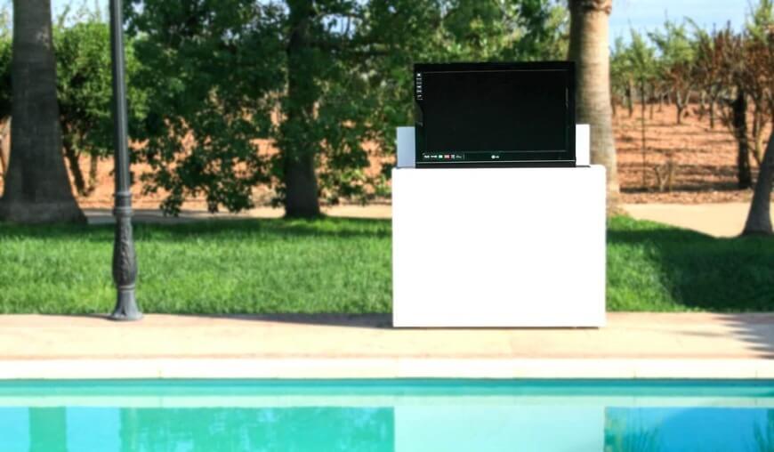 Resistencia a la intemperie. La tv aparece desde el mismo suelo.