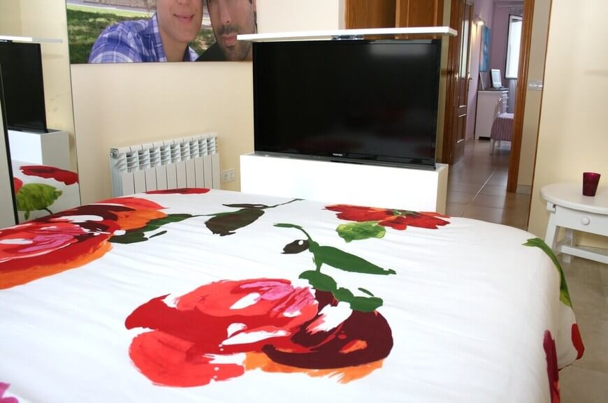 Mueble tv oculta y giratorio a los pies de la cama. Lacado en blanco y muy compacto logra amplificar el espacio útil del hogar.