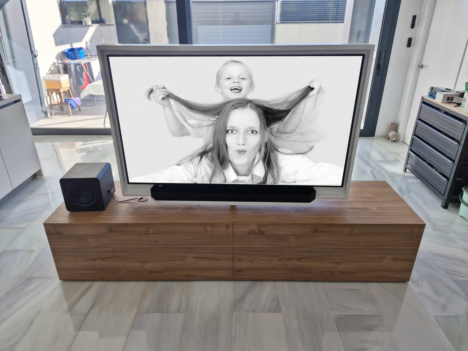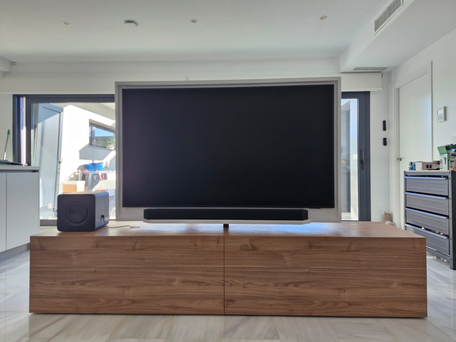 En Andalucía, espectacular mueble tv giratorio 360º con espacio para barra de sonido y tv de 65", diseño minimalista y moderno con muchos elementos y acabados personalizados.