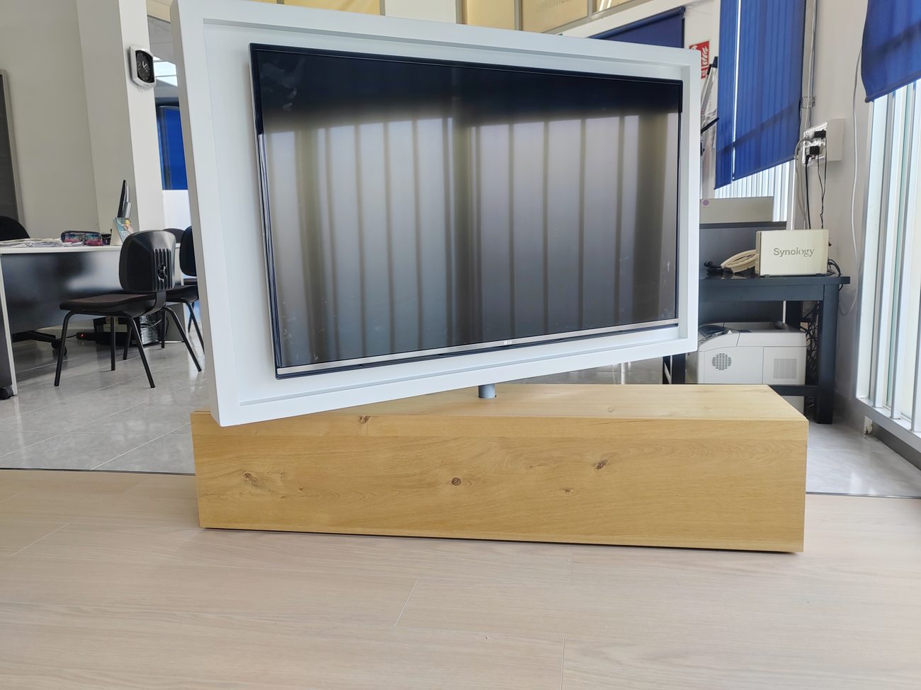 Mueble tv giratorio 360° en roble y módulo tv blanco lacado.