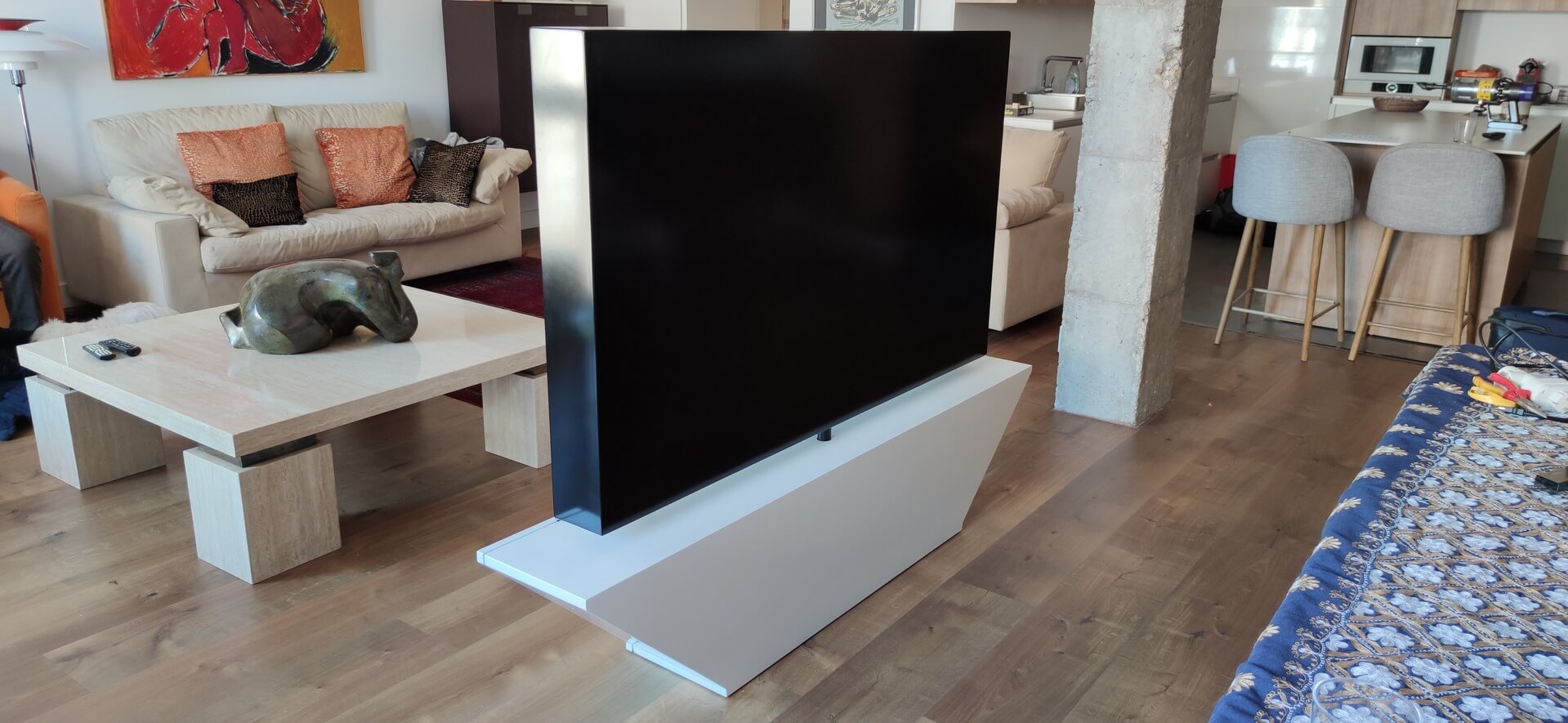 Mueble giratorio manual 360º instalado en el centro de Madrid. Diseño asimétrico en forma de V en mueble inferior. Mueble muy compacto y estable que logra girar una tv de 65", cubriendo todas las zonas del salón comedor. Lacado al horno en 2 colores. Puerta abatible frontal para almacenamiento. Medidas y diseño personalizados.